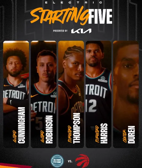 活塞首发:邓罗、哈里斯、奥萨尔、坎宁安、杜伦。